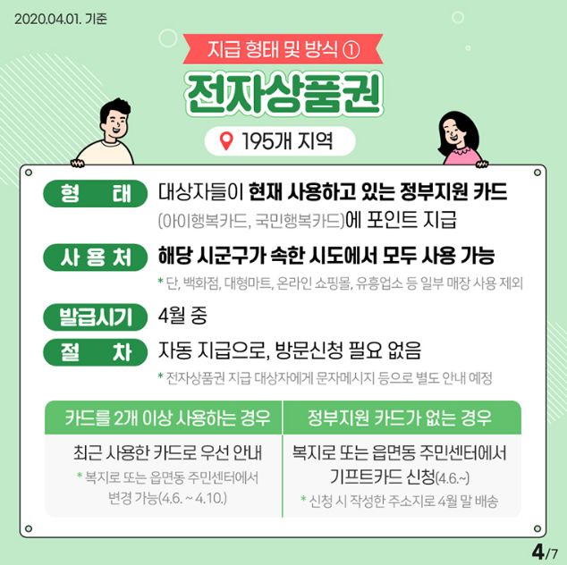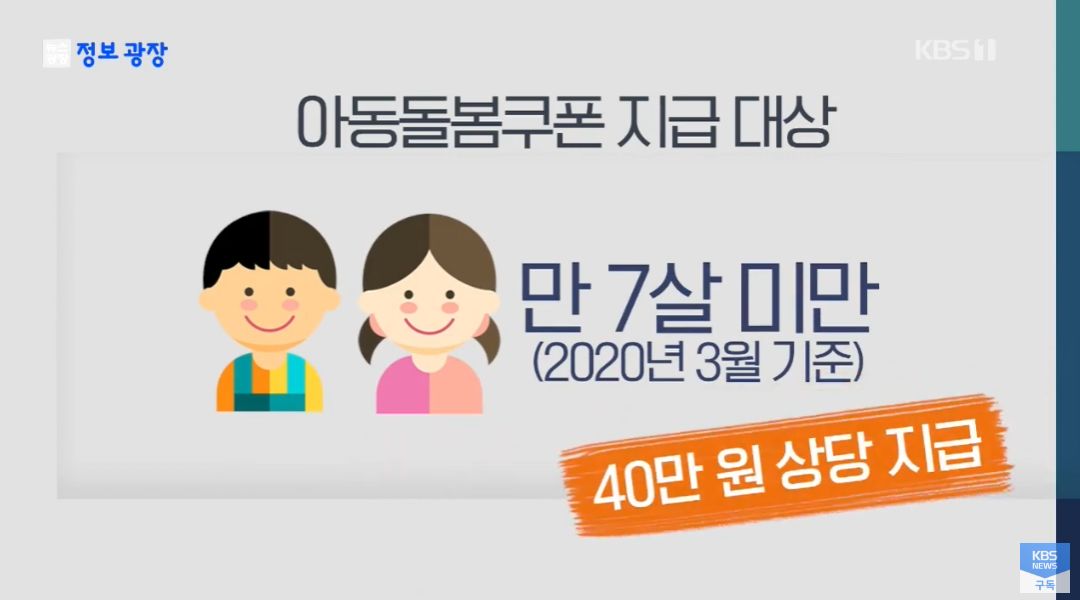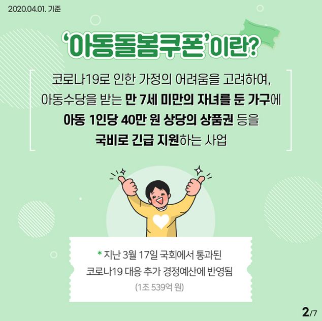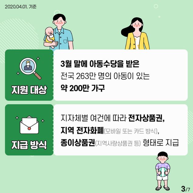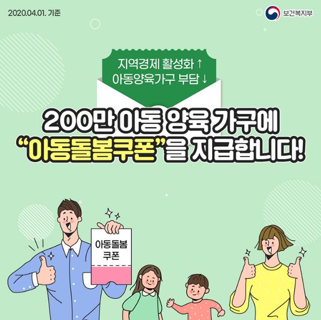 아동돌봄쿠폰 안내 - 지원대상 : 만 7세 미만 아동('20년 3월 기준, 아동수당 수급대상자) - 지원내용 : 아동 1인당 40만원 - 지급방식 : 전자상품권 197개 지역 / 지역전자화폐 7개 지역 / 종이상품권 25개 지역 ※ 지역전자화폐 또는 종이상품권은 아동 주민등록 기준 주민센터로 문의   〈2020.4.10 18시부로 아동돌봄쿠폰 수령카드 변경신청이 마감되었습니다.〉 (문의처 : 아동 주민등록 기준 주민센터)