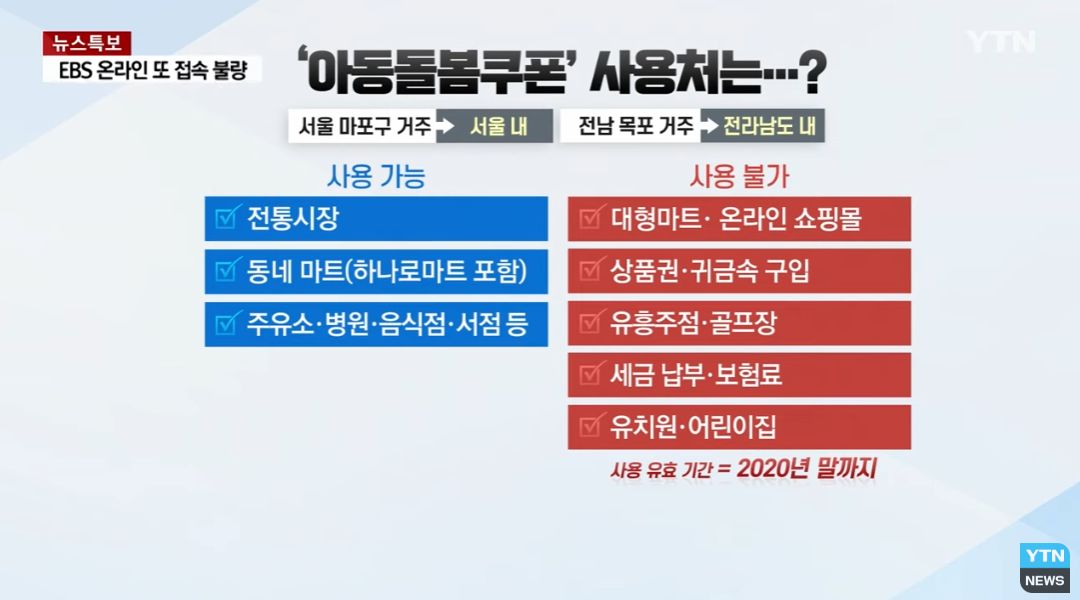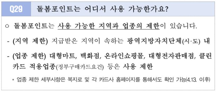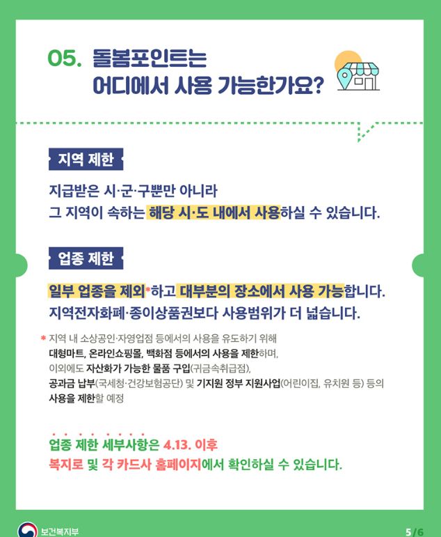 돌봄쿠폰 사용 제한업종: 대형마트(홈플러스, 이마트, 롯데마트, 코스트코 등의 기업형 슈퍼마켓), 백화점, 온라인을 통한 결제, 대형전자판매점, 면세점, 상품권 구매, 구금속 구매, 유흥업소, 위생업종(마사지 등의 대인 서비스), 레저업종(노래방, 골프장 등), 사행업종(오락실, 복권방 등) 등에서 사용이 제한되고