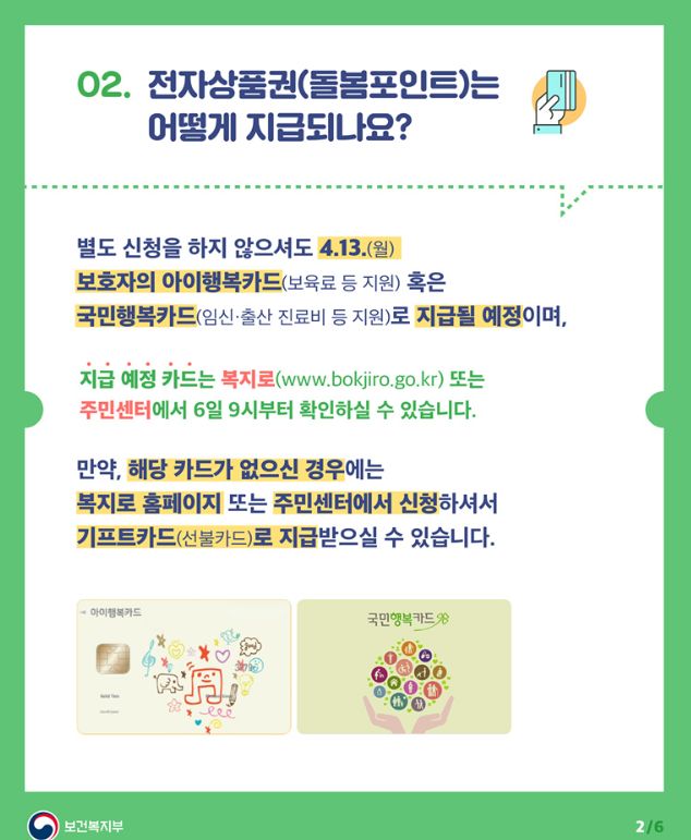 만약 아이행복카드, 아이사랑카드, 국민행복카드 등이 없는 부모님은 기프트카드 형태로 아동돌봄쿠폰을 지급받을 수 있습니다. 기프트카드 신청은 복지로 홈페이지와 거주지의 주민센터를 통해서 신청을 받고 있고, 수령은 5월초 정도에 가능하다고 합니다.
