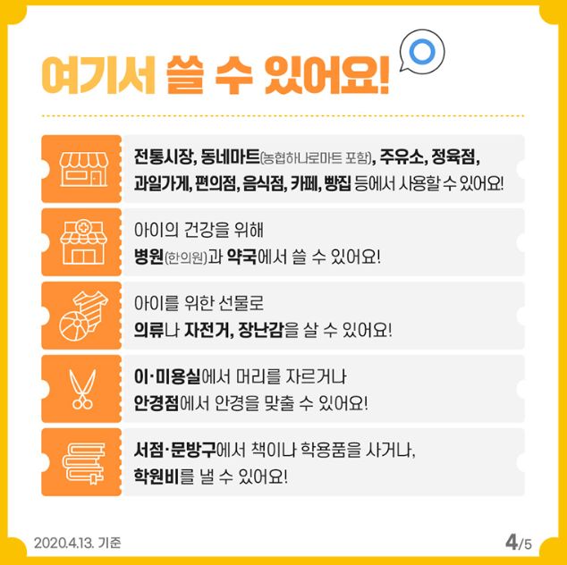 돌봄쿠폰 사용처: 동네마트(농협 하나로마트 포함), 전통시장, 정육점, 주유소, 편의점, 음식점, 과일가게, 카페, 미용실, 병원, 의류, 학원비, 서점, 안경점 등 아래에 설명드릴 아동돌봄쿠폰 사용 제한업종을 제외한 거의 모든 곳에서 사용이 가능합니다.