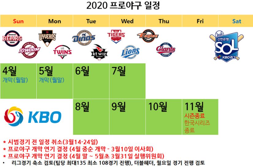 상세한 일정을 살펴보면 지금과 같은 계획대로 5월 5일(화)에 개막을 한다면 별다른 특이사항이 없으면 11월 2일(월)에 정규리그가 종료됩니다. 그리고 이틀 뒤인 11월 4일(수)부터 포스트시즌이 개막을 하여 늦어도 한국시리즈 7차전이 열릴 예정인 11월 28일(토)에 모든 끝낸다는 계획입니다. 다음 시즌을 위해서 늦어도 12월 안에는 2020 프로야구 일정을 마치려고 합니다.