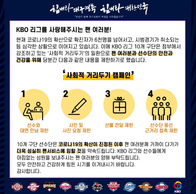 코로나 19 바이러스 사태로 사회적 거리두기는 많은 사람들의 생활에 영향을 미치고 있습니다. 이미 전 세계적 문제로 인해 해외축구, NBA 등이 중단됐고 미국 프로야구 MLB를 비롯한 국내 2020 프로야구, 프로축구 등이 연기된 상황입니다. 특히 우리나라에서 가장 인기 있는 스포츠인 프로야구의 개막 연기로 인해 야구팬인 저를 비롯한 많은 프로야구팬들의 아쉬움이 컸는데요, 드디어 그 기다림의 끝이 보이는 2020 프로야구 일정 개막이라는 반가운 소식이 들려왔습니다.