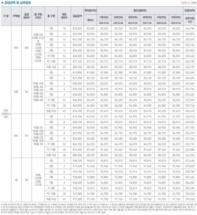 DMC리버파크자이&DMC리버포레자이(분양면적 및 분양가)