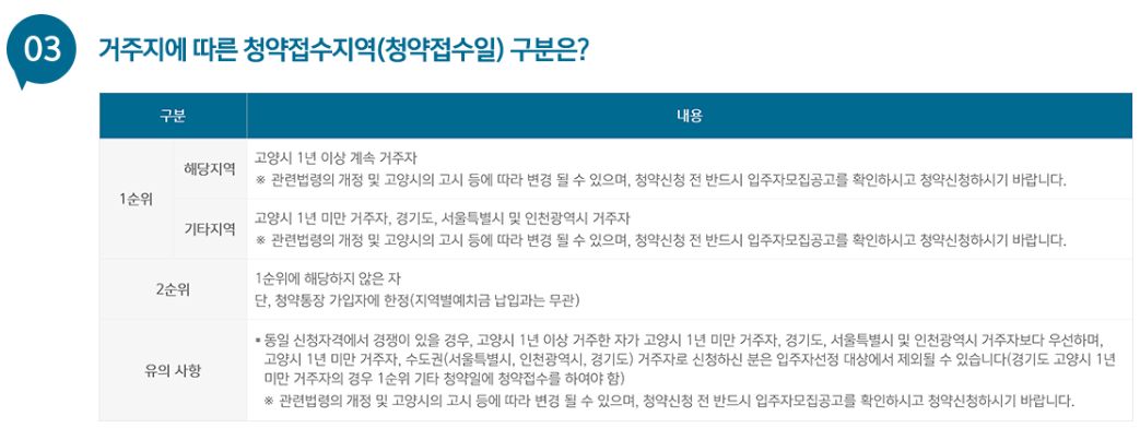 ▷최초 입주자 모집공고일(2020년 4월 24일) 현재 수도권(해당지역: 고양시 1년 이상, 기타 지역: 고양시 1년 미만, 경기도, 서울특별시, 인천광역시)에 거주하는 만19세 이상이 사람, 1순위 신청은 세대주만 가능. 입주자모집공고일 현제 고양시 1년 이상 계속 거주하는 신청자에게 우선 공급, 잔여세대 발생 시 기타지역 신청자에게 공급.