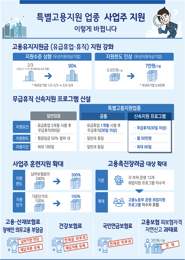 특별고용지원업종은 코로나 19 사태의 직격탄을 맞은 여행업, 관광숙박업, 관광운송업(항공, 전세버스 등), 공연업 네 가지 업종이 지정돼 있습니다. 이들 업종은 고용유지 지원금 지원(휴업수당의 90%, 단 대기업은 75%), 직업능력개발훈련 지원, 고용·산재보험 납부기한 연장, 장애인 고용부담금 납부기한 연장 등의 지원을 받습니다.