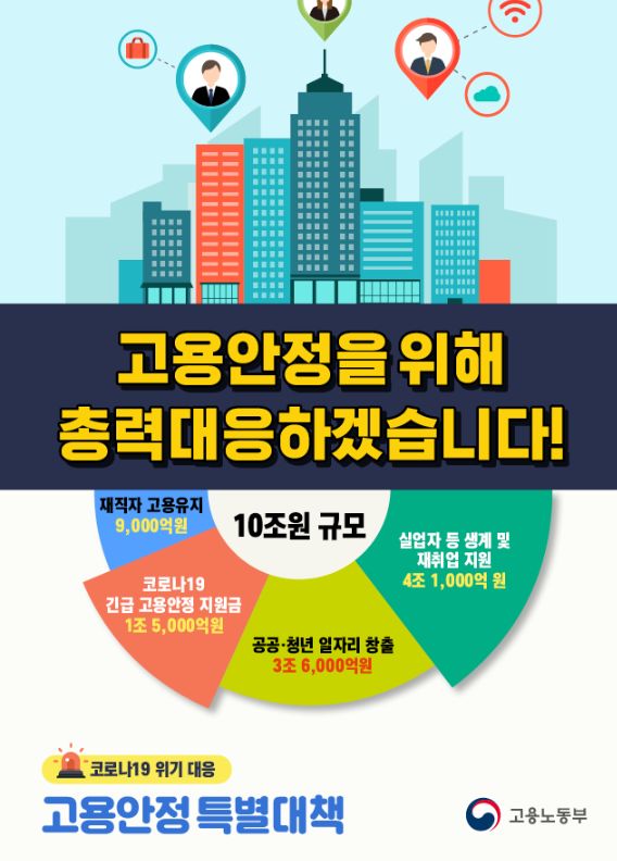 이번에 정부의 고용안정 특별정책을 위해 무급휴직 지원금에 4,800억 원, 긴급 고용안정 지원금에 1조 5,000억 원, 코로나 19로 인해 실업이 많아져서 실업급여 지원에도 3조 4,000억 원을 투입하는 등 총 10조 1,000억 원을 투입하여 고용안정에 최선을 다할 전망입니다. 하지만 당장 사용 가능한 예산은 8,000억 원뿐이기 때문에 나머지 9조가 넘는 예산에 대해서는 국무회의를 거쳐 3차 추경안에 담길 예정이라고 알렸습니다.