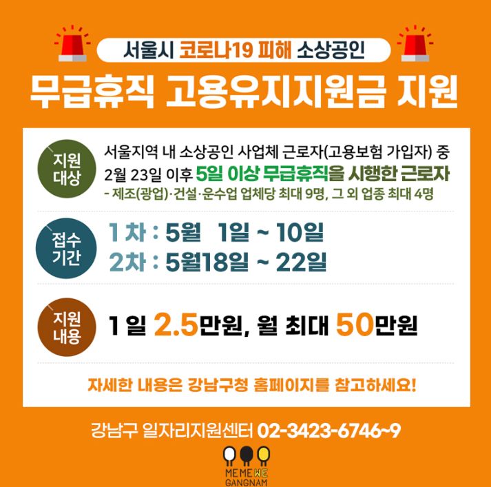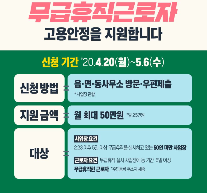 여기에 이번에 시행되는 무급휴직 신속지원 프로그램을 통해 기존 최소 유급휴직 1개월 이상 한 사업장에 대해 지원되던 무급휴직 지원금 시스템이 꼭 유급휴직을 하지 않더라도 무급휴직 즉시 무급휴직 지원금을 받을 수 있게 지원이 확대됩니다.