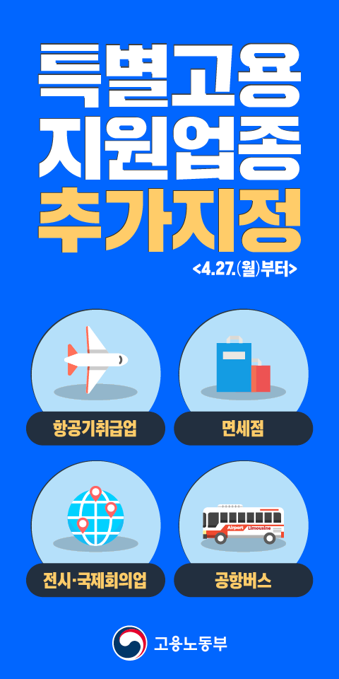 거의 모든 사람들이 코로나 19 사태로 인해 경제적 정신적 피해를 겪고 있는데요, 그중에 아주 밀접하게 피해를 입고 있는 여행업, 숙박업, 운송업, 예술업 여기에 이번에 특별고용지원업종으로 추가 지정된 항공지상조업, 면세점업, 전시, 국제회의업, 공항버스 업은 매우 우려스럽게 심각한 피해를 입고 있고 앞으로도 전망이 밝지는 않습니다.