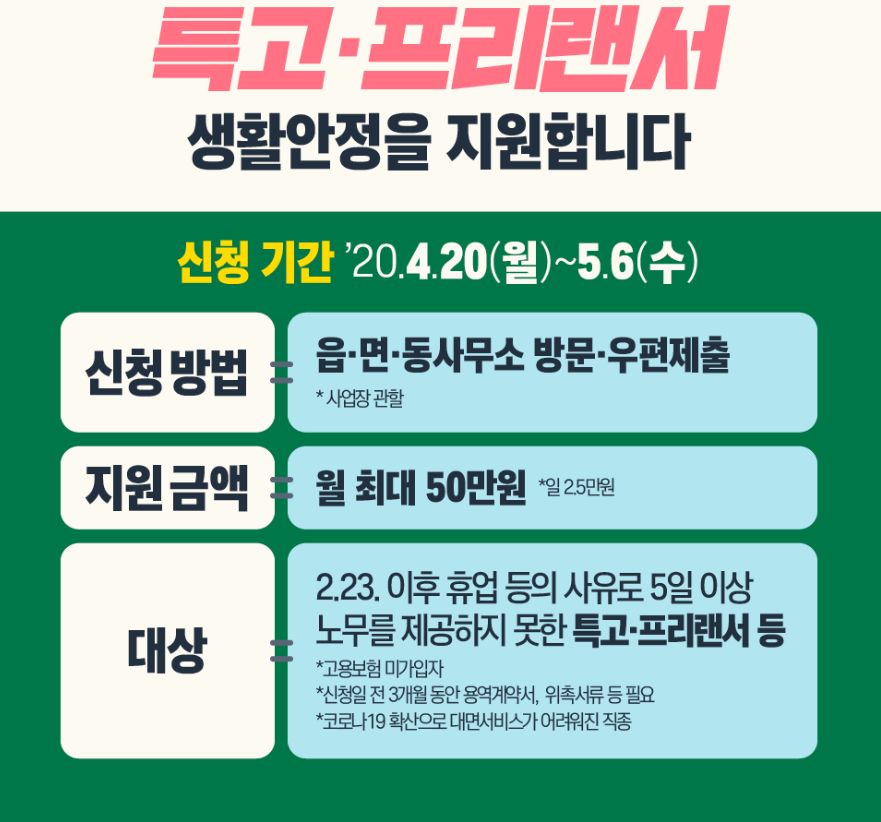 이와 함께 정부는 4월 22일 고용안정 특별대책을 발표하면서 고용의 사각지대에서 고통받고 있는 사람들에 대한 지원방법도 발표하였습니다. 긴급 고용안정 지원금을 통해서 고용보험에 가입되어 있지 않은 상태에서 소득이나 매출에 큰 타격을 입은 영세 자영업자, 노동자, 특수고용형태 근로자, 프리랜서 등의 93만 명에게 3개월간 월 50만 원씩 최대 150만 원을 지원하기로 결정하고 총 1조 5,000억 원을 긴급 투입하기로 하였습니다.