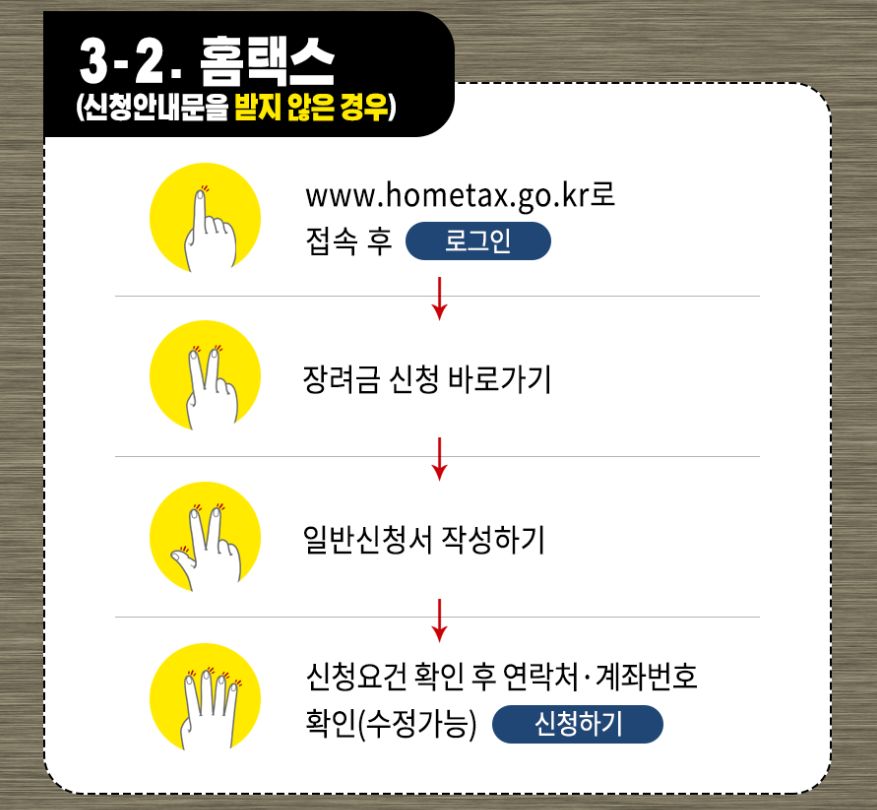 앱스토어(play스토어)에서 '손택스' 어플 설치, 앱실행후 근로·자녀장려금 신청 선택 후 진행 절차에 따라 신청 홈택스(www.hometax.go.kr) 로그인(공인인증서) 후 계좌 및 전화번호 입력 후 신청확인 전송