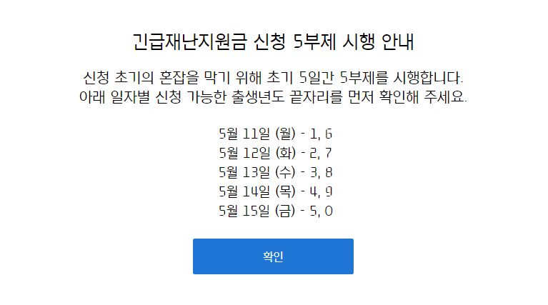 신청전 카드 포인트를 통한 긴급재난지원금 인터넷 신청의 경우 신청 초기 혼잡이 예상되어 초기 공적마스크 구매와 같은 5일간 5부제 신청제를 도입합니다. 아래의 표를 보고 일자별 신청 가능한 출생년도 끝자리를 확인 후 신청하시길 바랍니다. 5월 16일(토)부터는 출생년도 끝자리에 상관없이 신청이 가능합니다.