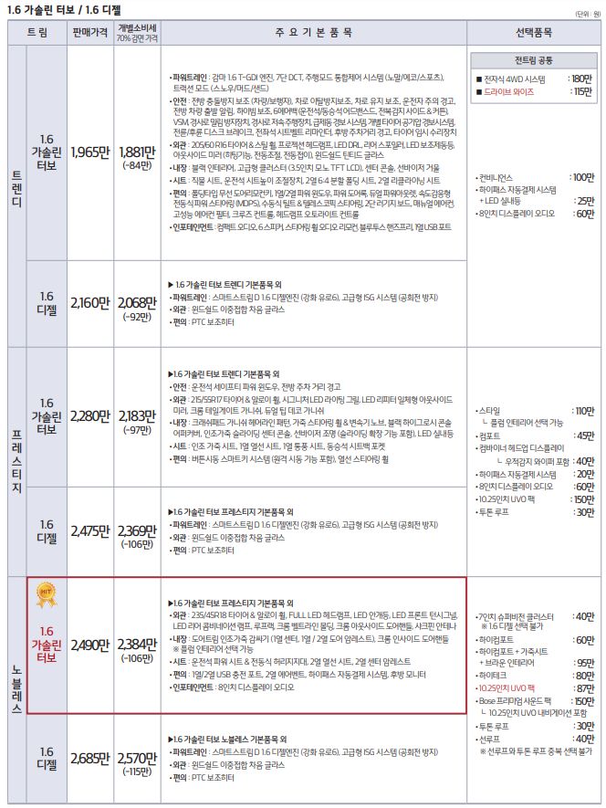 기아 소형 SUV 셀토스의 판매가격은 1.6 터보 가솔린 트렌디 등급은 1,900만 원대, 프레스티지 등급은 2,240 ~ 2,270만 원, 노블레스 등급은 2,450 ~ 2,480만 원입니다. 1.6 디젤은 노블레스, 프레스티지, 트렌디와 구성은 동일하고 가솔린 모델의 가격에서 190만 원이 추가된 가격입니다.