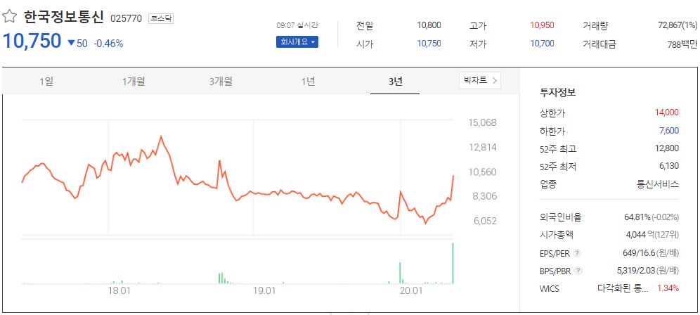 한국정보통신은 1986년 5월 9일 설립한 뒤, 1986년 신용카드조회기인 이지체크(Easycheck)를 개발해 1987년 국내 최초 신용카드 조회서비스를 실시하였고 1994년 직불카드 조회 공동망 VAN 사업자로 선정되었습니다. 1996년 고속버스승차권 전산화 상용서비스를 실시하였고 1997년 부산 하나로 교통카드 상용서비스를 시작하였습니다. 1998년 1월 코스닥에 상장하였습니다.