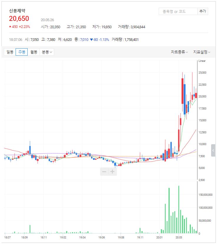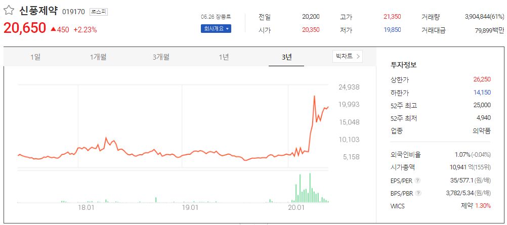 신풍제약은 완제의약품과 원료의약품 등의 제조 판매를 하는 기업입니다. 현재 경쟁력 강화와 미래 성장동력 확보를 위해 글로벌 신약개발에 힘쓰고 있습니다. 단기적으로는 개량 신약과 퍼스트제네릭 출시를 목표로 하고 있습니다. 클로로귄 성분의 말라리아 치료제인 말라클로가 주목받으면서 렘데시비르 관련주로 묶인 종목입니다.