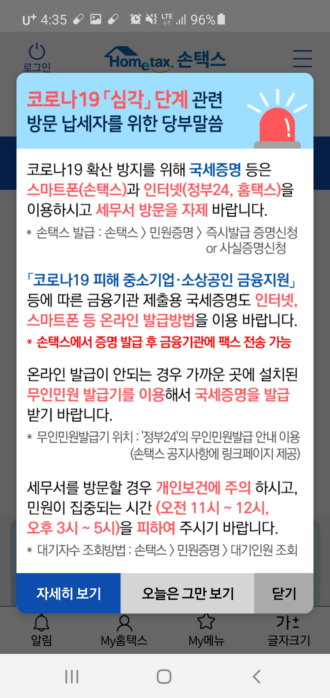 설치가 완료 됐으면 실행 버튼을 클릭 후 권한 허용 여부를 체크한 후 메인 페이지로 넘어갑니다. '코로나 19 심각단계 관련 방문 납세자를 위한 당부말씀' 팝업이 가장 먼저 보입니다.
