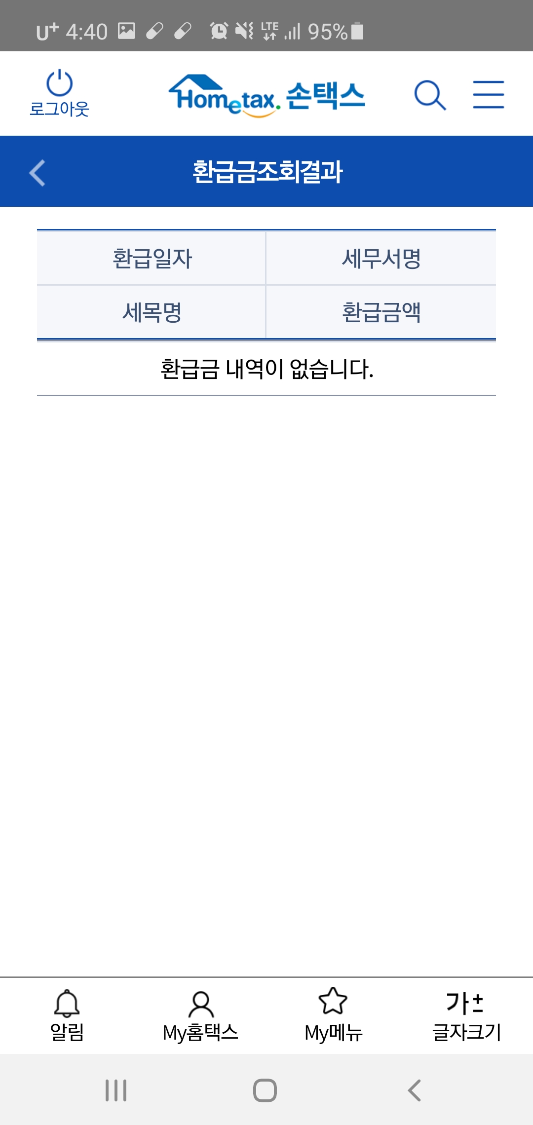 스마트폰에 저장되어 있는 신청자의 공인인증서를 통해 로그인을 하면 '환급금 조회 결과'를 바로 안내를 받을 수 있습니다. '환급금 내역이 없습니다.' 저는 역시나 환급금이 없습니다.