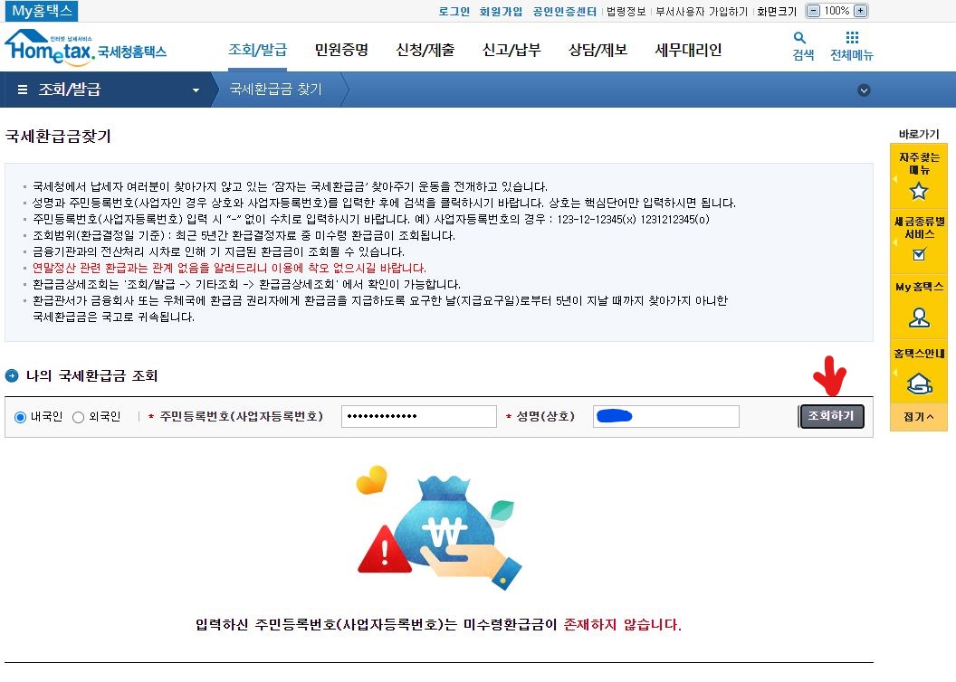 국세 환급금 조회 페이지에 넘어와서 별도의 프로그램 설치 없이 주민등록번호와 이름만으로 잠자고 있을지 모르는 국세 환급금 조회를 할 수 있습니다.