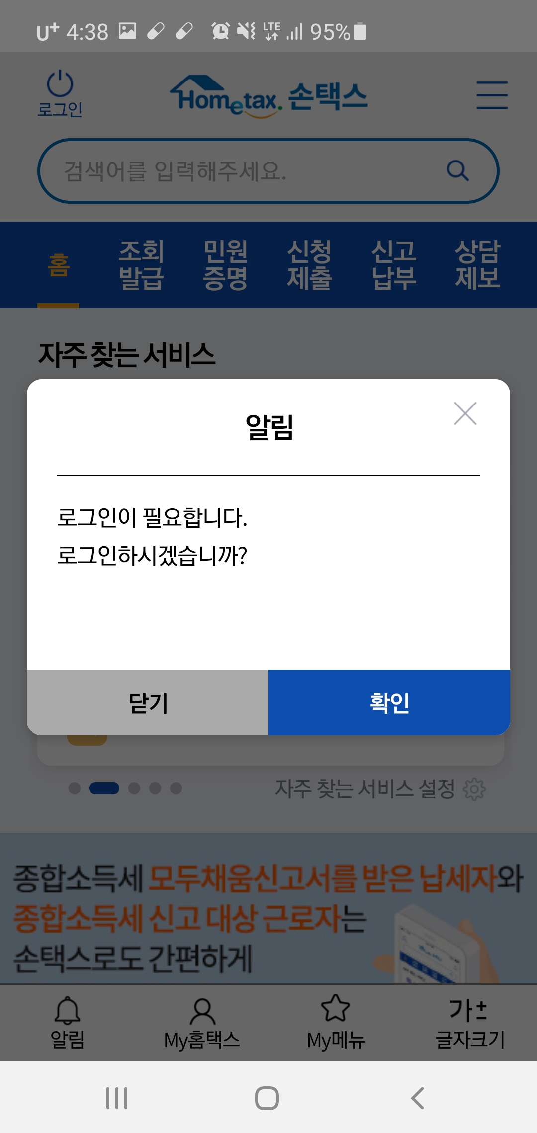 손 택스를 통해서 국세 환급금 조회를 위해서는 PC와는 다르게 로그인을 해야 합니다. 홈택스의 아이디와 비번 혹은 스마트폰에 공인인증서가 있어야지 조회가 가능합니다.
