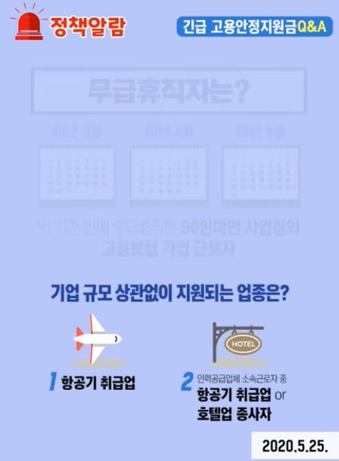 ▷50인 미만 기업의 고용보험에 가입되어 있는 자 중 2020년 3월 ~ 5월 사이에 무급 휴직한 근로자(항공기 취급업, 호텔업 종사자의 경우 기업 규모에 관계없이 지원)