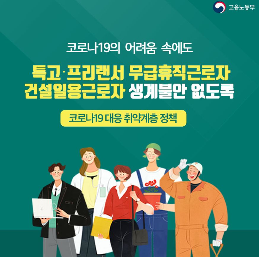 안녕하세요 이번 포스팅에서는 코로나 19로 인해 생계에 어려움을 겪고 있는 특수형태 근로종사자, 프리랜서, 영세 자영업자, 무급휴직 근로자분들을 위해 정부에서 지원하는 긴급 고용안정 지원금 신청 대상에 대해서 알아보겠습니다. 우리나라에서 확장세가 안정되는듯 했던 코로나 19 가 최근 인천 학원강사 확진자 사태와 물류센터 대규모 확진 사태로 위기가 이어지고 있습니다. 이로 인해 고용형태가 불안정한 분들의 생활이 나아질 기미가 보이지 않습니다.