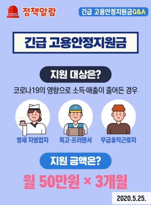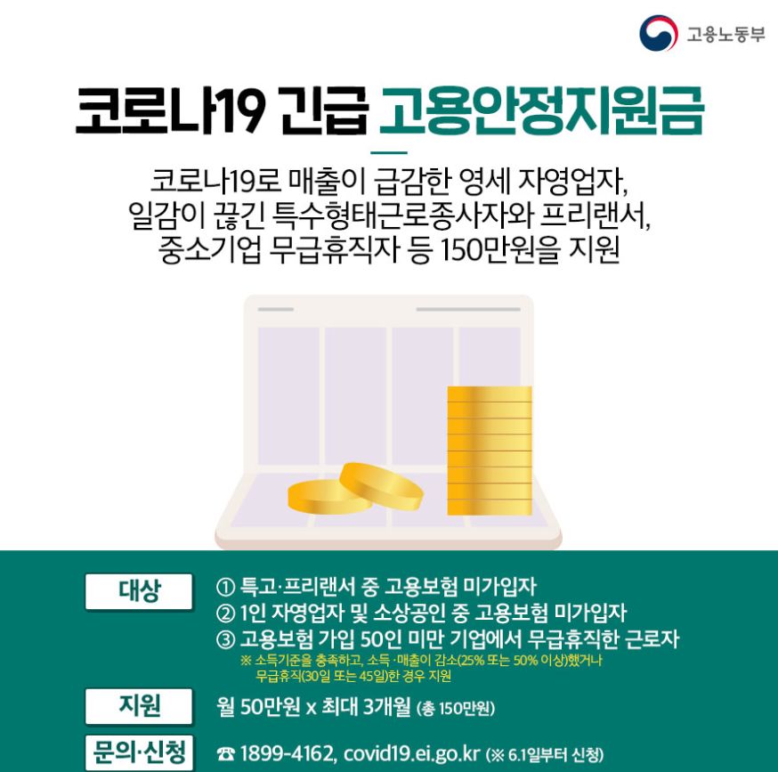 안녕하세요 이번 포스팅에서는 코로나 19로 인해 생계에 어려움을 겪고 있는 특수형태 근로종사자, 프리랜서, 영세 자영업자, 무급휴직 근로자분들을 위해 정부에서 지원하는 긴급 고용안정 지원금 신청 대상에 대해서 알아보겠습니다. 우리나라에서 확장세가 안정되는듯 했던 코로나 19 가 최근 인천 학원강사 확진자 사태와 물류센터 대규모 확진 사태로 위기가 이어지고 있습니다. 이로 인해 고용형태가 불안정한 분들의 생활이 나아질 기미가 보이지 않습니다.
