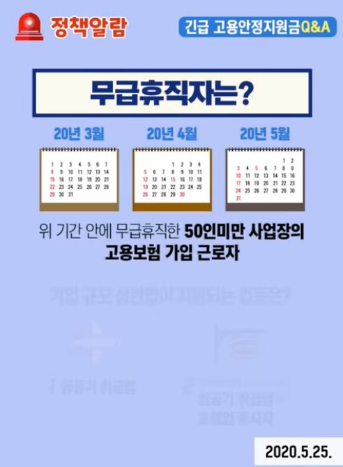 ▷50인 미만 기업의 고용보험에 가입되어 있는 자 중 2020년 3월 ~ 5월 사이에 무급 휴직한 근로자(항공기 취급업, 호텔업 종사자의 경우 기업 규모에 관계없이 지원)