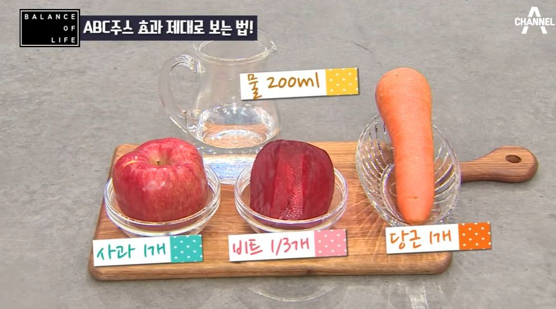 ABC 주스는 우리나라뿐아니라 미국과 유럽 등 전 세계적으로 열풍에 휩싸인 식품입니다. ABC 주스의 이름은 주스를 만드는 재료인 사과 애플의 A, 비트의 B, 당근 캐럿의 C의 앞자리를 갖고 와서 만들어진 이름입니다.
