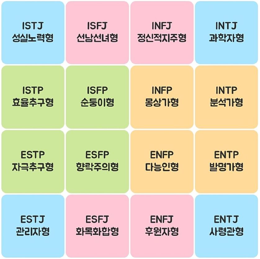 MBTI 성격유형 검사를 통해 개인이 인식하고 판단하는 과정에서 어떠한 심리적 선호를 사용고 이용하는지를 분석하해 이 결과를 토대로 4가지 선호 지표로 구성, 총 16가지 성격 유형으로 분류한 것을 말합니다.