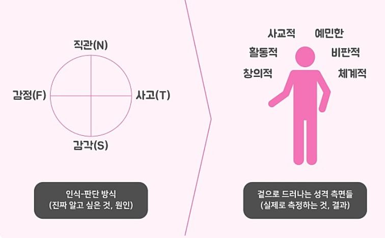 MBTI가 나타내는 4가지 선호 지표는 정신적 에너지 방향성을 나타내는 외향-내향(E-I) 지표, 정보 수집을 포함한 인식 기능을 나타내는 감각-직관(S-N) 지표, 수집한 정보를 이용하여 합리적 판단과 결정 내리는 사고-감정(T-F) 지표, 인식 기능, 판단 기능이 실생활에서 적용되어 나타난 생활양식을 보여 주는 판단-인식(J-P) 지표로 구성이 되어있습니다.