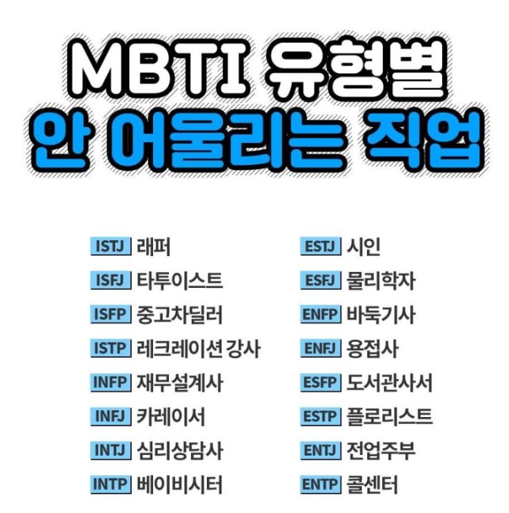 MBTI 성격유형 검사 결과가 E형이던 I형이던, S형이던 N형이던, 또 T형이던 F형이던, J형이던 P형이던 하나의 유형에 자신과 타인을 끼워 넣는 사고에 갇혀서는 안 됩니다. 참고용으로 자신의 긍정적인 부분을 부각하고, 부정적 부분은 발전시키기 위한 용도로 사용되어야 합니다.