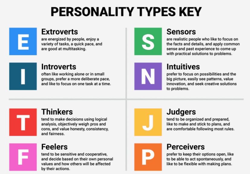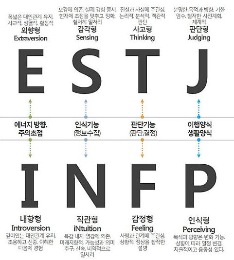 MBTI가 나타내는 4가지 선호 지표는 정신적 에너지 방향성을 나타내는 외향-내향(E-I) 지표, 정보 수집을 포함한 인식 기능을 나타내는 감각-직관(S-N) 지표, 수집한 정보를 이용하여 합리적 판단과 결정 내리는 사고-감정(T-F) 지표, 인식 기능, 판단 기능이 실생활에서 적용되어 나타난 생활양식을 보여 주는 판단-인식(J-P) 지표로 구성이 되어있습니다.