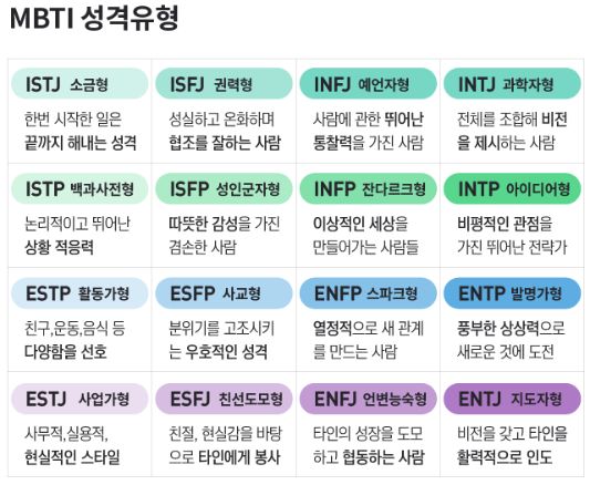 MBTI 성격유형 검사를 통해 개인이 인식하고 판단하는 과정에서 어떠한 심리적 선호를 사용고 이용하는지를 분석하해 이 결과를 토대로 4가지 선호 지표로 구성, 총 16가지 성격 유형으로 분류한 것을 말합니다.