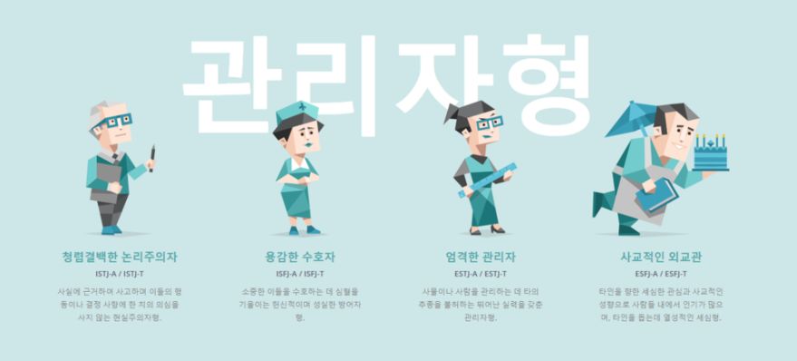 | 책임감이 강함, 현실적, 매사에 철저하고 보수적이다. | 차분하고 헌신적, 인내심이 강함, 타인의 감정 변화에 주의를 기울임. | 높은 통찰력으로 사람들에게 영감을 줌, 공동체의 이익을 중요시함. | 의지가 강함, 독립적, 분석력이 뛰어남. |