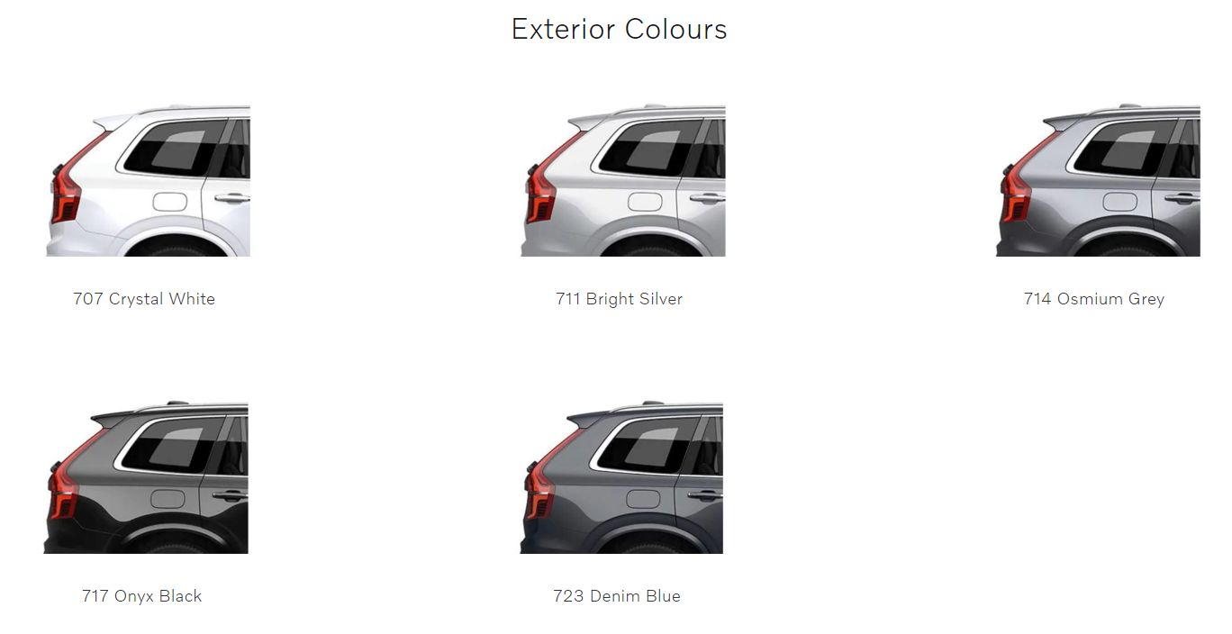 또한 새로운 디자인의 듀얼 테일 파이프와 다이아몬드 컷 휠(20·21인치)과 크롬으로 마감하여 고급스러움을 더한 범펴 등을 통해 볼보 xc90의 정체성을 잘 보여 줍니다. 외부 색상은 Crystal White, Bright Silver, Osmium Grey, Onyx Black, Denim Blue의 5가지 색상을 선택할 수 있습니다.
