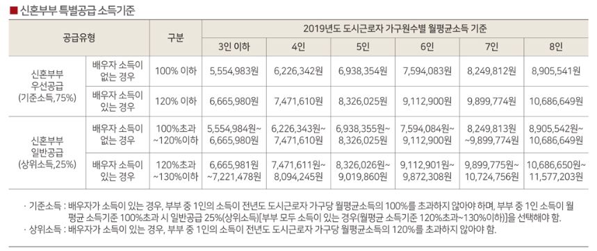 2019년 기준 도시근로자 월평균 소득은 3인 이하의 가족은 555만 원인데 맞벌이(120% ~ 130%)의 경우 666만 원 ~ 722만 원 선입니다. 위의 기준에 따라 1 자녀를 가진 외벌이 가정 월 소득이 600만 원이라면 민영주택 신혼부부 특별공급에 당첨될 수 없습니다.