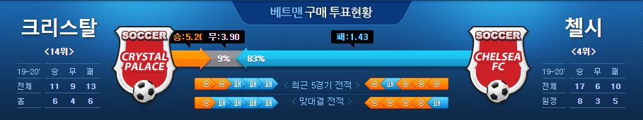 ▶크리스탈 팰리스 vs 첼시 5경기 전적 1승 0무 4패(크리스탈 팰리스 홈 1승 1패)