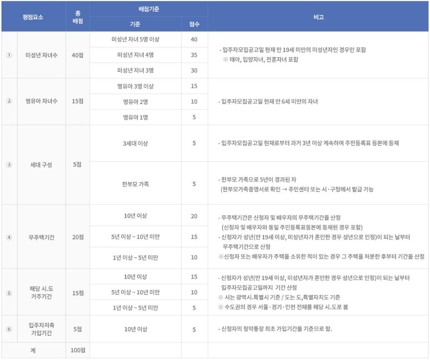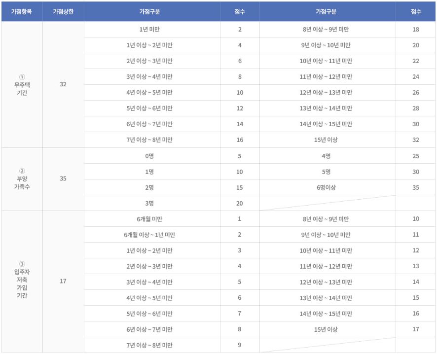 ▶청약 가점: 청약통장의 가입 기간, 부양가족 수, 무주택기간 세 가지 가점을 기준으로 하며 84점이 최대입니다.