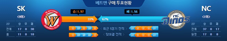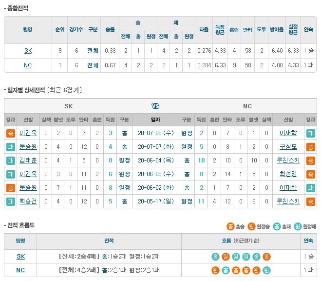 ▷SK vs NC, 올 시즌 상대전적 2 : 6 NC 우위