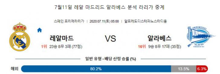 주전 수비수 2명이 징계로 이탈하는 레알 마드리드, 리그 재개 후 견고한 수비의 도움으로 연승을 이어가고 있는 만큼 주전 수비수의 결장은 우려되는 부분입니다. 다만 주전 공격수 카림 벤제마를 중심으로 2선과 중원의 경기력이 훌륭하고 원정팀 알라베스 역시 수비진의 핵심인 두아르테가 빠진 상태라는 점, 그리고 알라베스가 올 시즌 원정만 가면 무기력하기 때문에 우승을 향해가는 레알 마드리드의 걸림돌은 되지 않을 전망입니다.