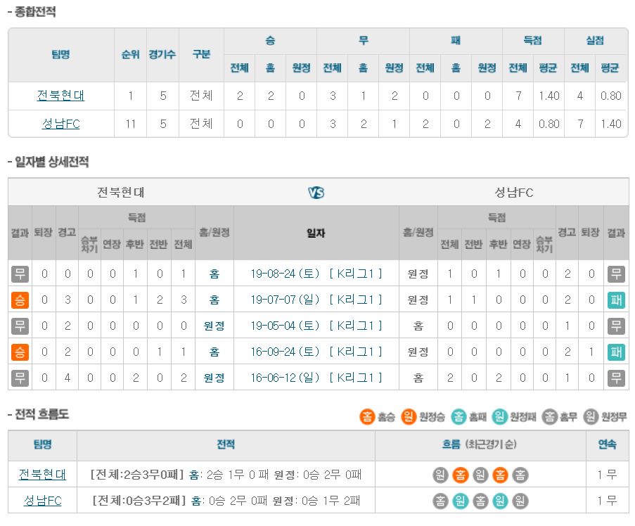 ▶전북 현대 vs 성남 FC 5경기 전적 2승 3무(전북 현대 홈 2승 1무)