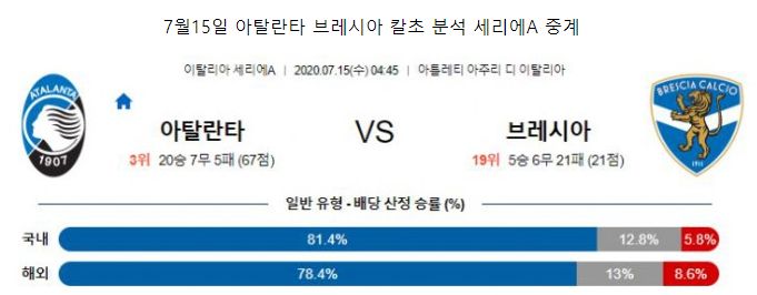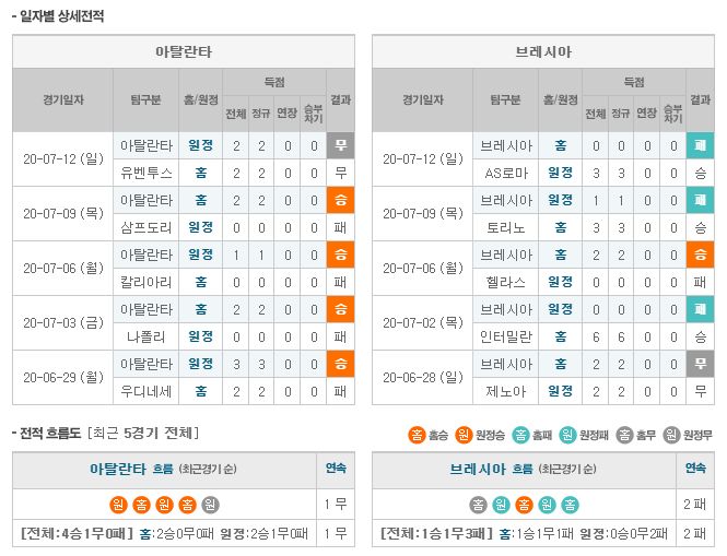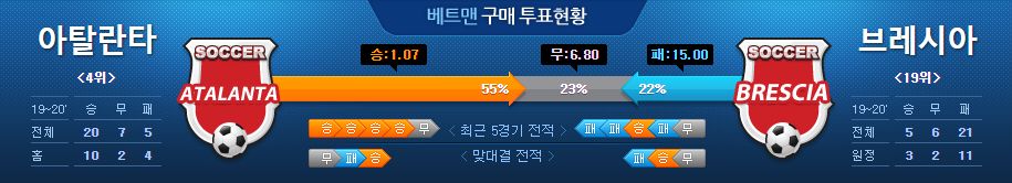 리그 3위 아탈란타는 유벤투스 상대로 경기력에 비해 아쉬운 무승부를 기록했지만 유벤투스를 상대로 경기력에서 만큼은 우위를 점할 정도로 리그 재개 후의 경기 과정과 결과가 좋습니다. 브레시아가 베로나전 승리 이후 2경기 동안 연속 3실점으로 수비가 무너지고 있다는 점을 생각한다면 닥공의 아탈란타의 무난한 승리가 예상되는 경기입니다.