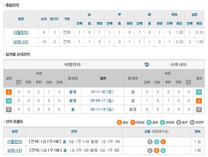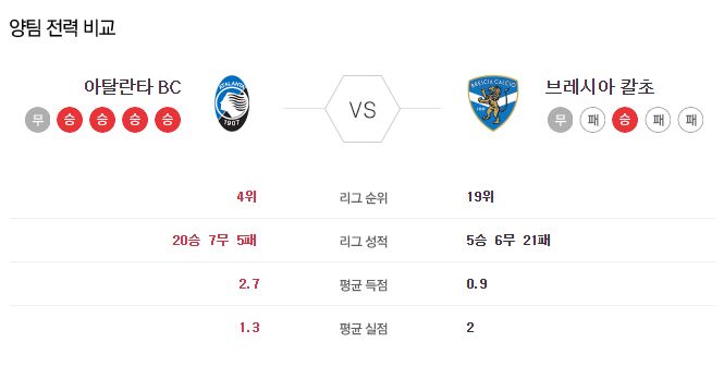 ▶아탈란타 vs 브레시아 칼초 3경기 전적 1승 1무 1패(아탈란타 홈 1무 1패)
