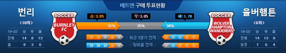 번리는 지난 리버풀 원정에서 1-1 무승부를 기록했습니다. 리버풀의 홈 전승의 역사적인 기록 도전에 제동을 걸면서 최근 5경기 3승 2무로 무패를 기록하고 있습니다. 공격수 반스 / 미드필더 코크 / 수비스 깁슨, 벤 미, 로튼 등 기존 부상자들 외에 별다른 전력 누수가 없는 상황입니다. 주전 공격수 우드의 복귀에 5경기 동안 2실점만 내준 탄탄한 수비력이 최근의 번리 특유의 선 굵은 축구가 완성되는 모습을 보여주고 있는 만큼 울버햄튼을 상대로도 버티는 힘을 기대할 수 있어 보입니다.