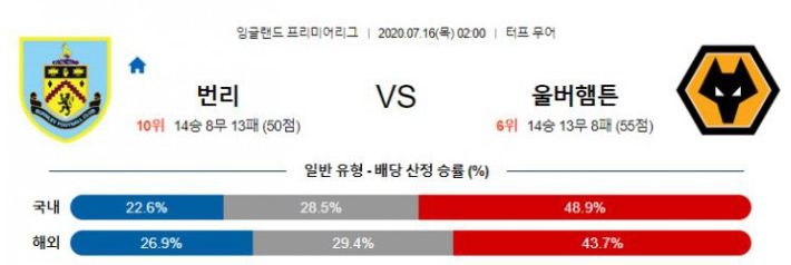 번리는 이미 우승을 확정 지은 리버풀 안필드 원정에서 1-1 무승부를 기록하며 5경기 연속 무패를 기록할 정도로 최근 탄탄한 수비를 자랑하고 있습니다. 최근 번리 특유의 선 굵은 축구의 위력을 보여주고 있는 만큼 공격수 트라오레의 출전시간이 제한적인 울버햄튼이 번리의 탄탄한 수비에 고전할 수 있는 경기로 보입니다. 양팀다 최근 수비가 탄탄한 하기 때문에 경기 결과는 무승부를 거둘 가능성이 높아 보입니다.