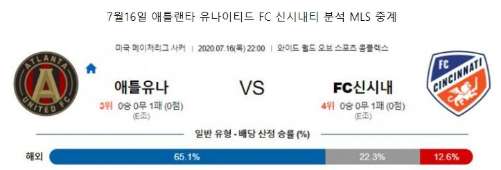 중립구장인 ESPN 와이드월드오브스포츠 컴플렉스에서 열리는 토너먼트 조별예선입니다. 애틀랜타 유나이티드는 주전 공격수 요세프 마르티네스가 부상이기 때문에 분명 마무리에 있어 문제가 생긴 상황입니다. 1경기에서도 유효슈팅을 9개로 상대편 골문을 두들렸지만 득점에 성공하지 못했습니다. 신시내티는 스탐 감독 부임 이후 첫 경기에서 콜럼버스에 0-4 완패를 당했습니다. 요소요소 필요한 보강을 통해 반등을 노리고있지만, 앞선 리그 2경기에서 모두 패하며 수비조직력을 가다듬는 문제는 꽤 많은 시간이 필요할 것으로 보입니다. 1패를 허용한 두 팀간의 맞대결이지만, 전력차는 극명하다고 할 수 있습니다. 두 팀은 올 시즌 리그 중단 이전에 벌써 한 차례 맞붙었고, 애틀랜타가 홈에서 2-1로 승리한바 있습니다. 핵심 공격수 로카디아마저 부상으로 빠진 신시내티라의 젼력누수를 감안하면, 애틀랜타가 마르티네스 없이도 차이를 벌리기엔 충분해보입니다.
