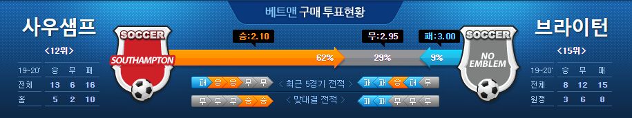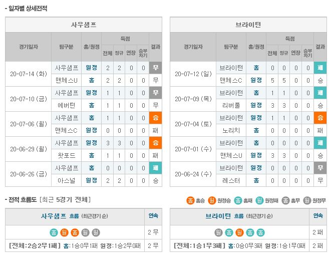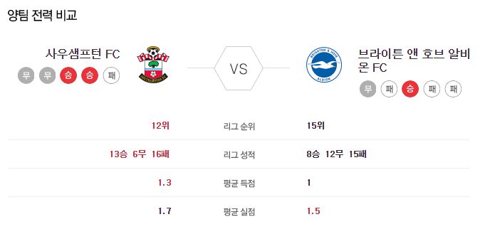 ▶사우샘프 vs 브라이턴 5경기 전적 2승 3무(사우샘프 홈 2무)