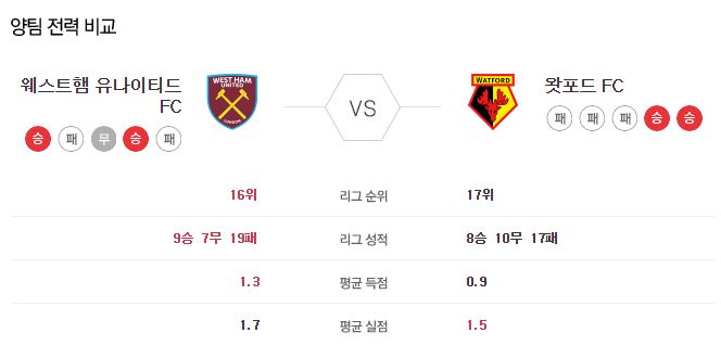 왓포드는 현재 리그 17위에 위치해 있으며 직전 경기에서 까다로운 상대인 뉴캐슬을 상대로 2:1 승리를 가져오며 시즌막판 2연승을 하여 잔류를 갈망하고 있습니다. 올 시즌 전체 전적은 8승 10무 17패 승점 34점을 기록하고 있습니다. 최근 원정 경기에서는 하락세를 벗어나지 못하고 무려 6연패의 부진에 빠져 있습니다. 또한 주요 득점원인 트로이가 무릎 부상으로 인해 출전이 어려울 것으로 보여 공격력에 적지 않은 영향력을 끼칠 것으로 보입니다. 직전 경기에서 2득점을 만들어 냈지만 두 골 모두 페널티킥으로 만들어 냈습니다. 왓포드가 페널티킥 득점을 제외한 전체적인 공격력에서는 다소 아쉬운 모습을 보이고 있어 공격 라인에 변화가 절실히 필요해 보입니다. 웨스트햄과의 팀 전력에서 왓포드가 다소 부족한 것이 사실이며 여기에 최근 경기력이 떨어지는 공격의 모습을 보이고 있기 때문에 앞서 언급한 대책을 만들어 내지 못한다면 왓포드는 웨스트햄에게 패배할 가능성이 매우 높아 보입니다.