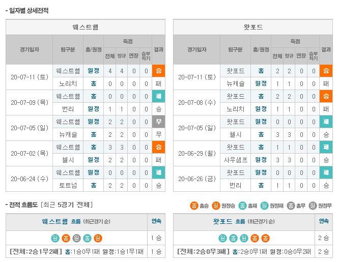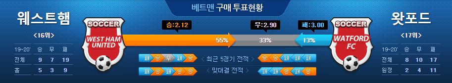 웨스트햄은 팀내 공격포인트 1위 스노드그래스가 결장중이기 때문에 실점을 하게되면 만회하기가 힘든 상황입니다. 하지만 최근 안토니오, 수첵 등이 상대진영에서 제공권 장악을 해주면서 상대 문전앞에서 볼 점유 비중이 높아졌습니다, 특정 선수에게만 의존하는 양상이 줄어들며 득점력도 좋아지고 있습니다. 왓포드는 역습 전개시 중심적인 임무를 수행하고 있는 데울로페우가 부상당하며 그 날카로움이 떨어질 수밖에 없는 상황이다. 웰백이 고군분투하고 있지만, 리그 재개 이전의 경기력의 수준에는 못 미치고 있습니다. 두 팀 모두 강등으로부터 자유롭지 못한 상황이며. 왓포드는 올시즌 원정에서 2승 4무 11패로 최악의 경기력을 보이고 있습니다, 재개 이후에도 원정에서는 2경기 모두 득점에 실패하며 무기력하게 패했습니다. 게다가 팀내 득점 1위 트로이 디니마저 출전이 불투명한 상황이기 때문에 선재골을 허용한다면 따라가기가 쉽지 않을 것으로 보입니다. 웨스트햄은 직전 경기에서 안토니오가 네 골을 넣으며 팀에게 승리를 안겼고, 이번 경기를 통해 스노드그래스의 복귀할 가능성이 있습니다. 유독 위험지역에서 파울이 많은 왓포드이기에, 제공권이 좋은 웨스트햄의 선수들이 끈적하게 경기를 한다면 득점이 가능할 것입니다.