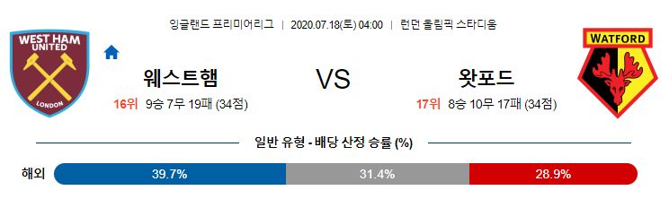 웨스트햄은 현재 리그 16위에 위치해 있으며 직전 경기에서 노리치에게 4:0 완승을 거뒀습니다. 올 시즌 35경기 9승 10무 17패 승점 34점을 기록하고 있고, 승점은 이번 경기의 상대팀은 왓포드와 같은 상황입니다. 두팀 모두 강등권에 위치해 있는 본머스와 승점이 3점 차이밖에 나지 않은 상황이기 때문에 앞으로 남은 경기에서 좋은 결과를 만들어서 강등을 피하기 위해서는 반드시 승점 3점을 가져와야 하는 상황입니다. 웨스트햄은 직전 경기에서 4득점을 만들어낸 안토니오의 경기력이이 올라오면서 공격 상황에서의 해결사 역할을 해주고 있습니다. 그러므로 지난경기에서 경기내용이나 결과에 좋은 결과를 얻은 분위기를 유지하는 것이 가장 중요할 것으로 판단됩니다. 왓포드와 이전 맞대결에서 2승을 기록한 만큼 어렵지 않은 경기가 될 것이 예상되고, 최근 폼이 올라오고 있는 선수들과 좋은 분위기를 보이고 있기 때문에 이번 경기에서 홈팀 웨스트햄이 이변 없이 승리를 가져올 수 있을 것으로 예상하는 됩니다.