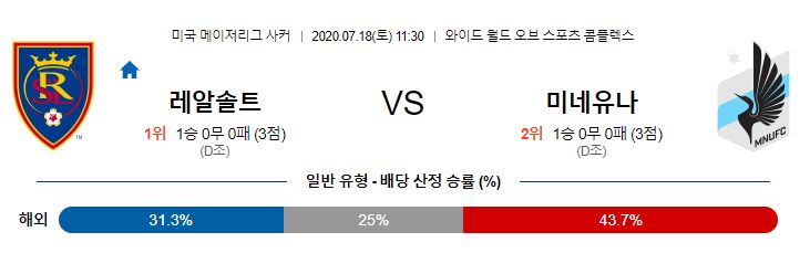 중립구장인 ESPN 와이드월드오브스포츠 컴플렉스에서 열리는 토너먼트 조별예선이다. 솔트레이크는 지난 시즌 단단한 수비조직력을 바탕으로 좋은 결과를 만들어 냈습니다. 올 시즌 리그 중단전 2경기에서는 모두 무승부를 거뒀습니다. 이번경기에서는 핵심 센터백 네덤 오누오하가 이번 토너먼트 내내 결장하기 때문에, 단단한 수비조직력에 금이갈 것으로 예상되고, 공수 양면에서 손실이 이만저만이 아니라 할 수 있습니다. 미네소타의 전력누수도 심상치 않습니다. 핵심 센터백 오파라가 부상으로 이번 토너먼트에 불참하는데, 그의 결장은 팀적으로 큰 손실이라 할 수 있습니다. 그렇지않아도 시즌 초반 2경기에서 실점이 꽤 나왔던 미네소타 입장에서는 오파라의 부재가 꽤나 뼈아플 것으로 전망됩니다. 1경기에서도 캔자스시티 골키퍼의 퇴장이 아니었다면 역전이 나오지 못했을 것입니다. 적어도 이번 토너먼트 기준으로는 솔트레이크의 경기력이 미네소타보다 좀 더 낫고, 센터백의 공백을 줄이는 부분 역시 솔트레이크가 더 익숙해져 있습니다. 크릴라흐가 다시 한 번 차이를 만들어낼 수 있을 것으로 예상됩니다.